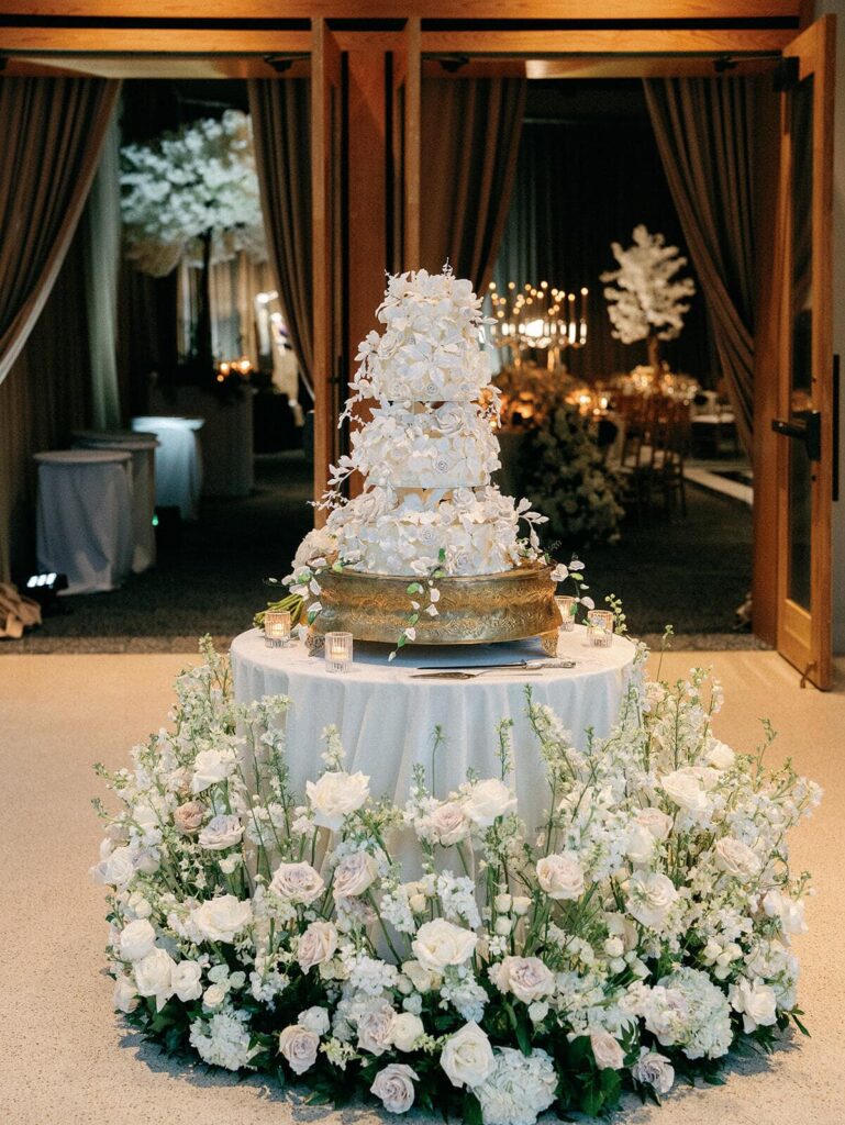 From their custom monogram to cocktail napkins with notes “written” by their dog, Halle and Jordan didn’t miss a single opportunity to incorporate their fun-loving personalities into their wedding. Guests were greeted with witty decaled cups with quotes from the couple, a life-sized ice sculpture of their pup, and a cake so carefully detailed with edible flowers that it could’ve been plucked straight from the garden. Espresso martinis made their rounds to keep the energy up, followed by tacos for a midnight snack. Light-up cowboy hats brought Texas charm to the dance floor – and the appearance of the San Antonio Spurs mascot was a delightful surprise for the groom.