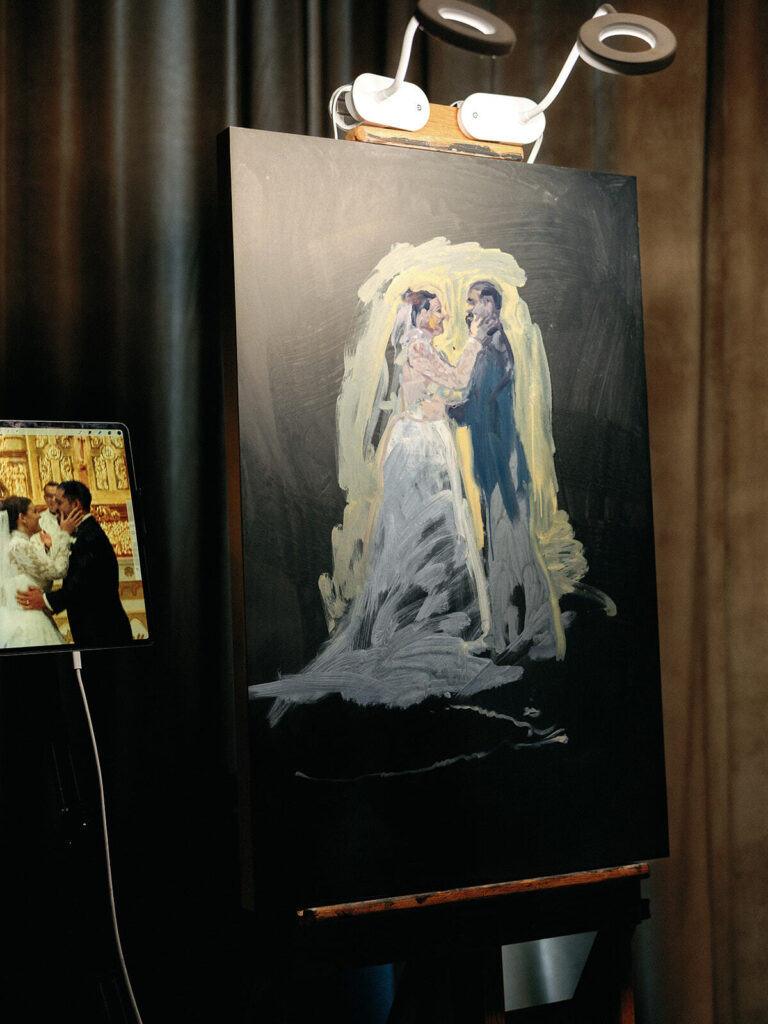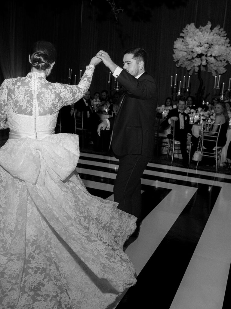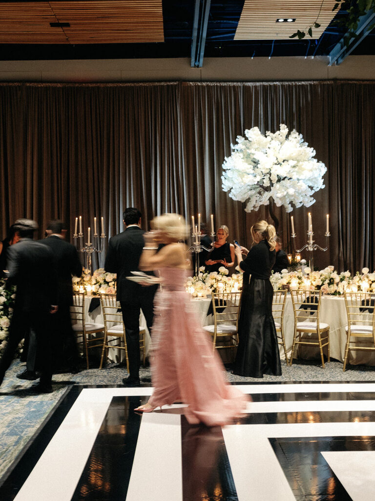 The Witte Museum offers a one-of-a-kind setting in San Antonio. Though the cocktail hour had to be moved indoors due to the weather, the change only highlighted the museum’s unique atmosphere. Guests mingled among curated collections while a live painter crafted a portrait of the ceremony — an exquisite reminder that this day, too, was a work of art in motion. The reception space came alive under towering white cherry blossom trees, set against a black-and-white striped dance floor that felt equal parts classic and current.